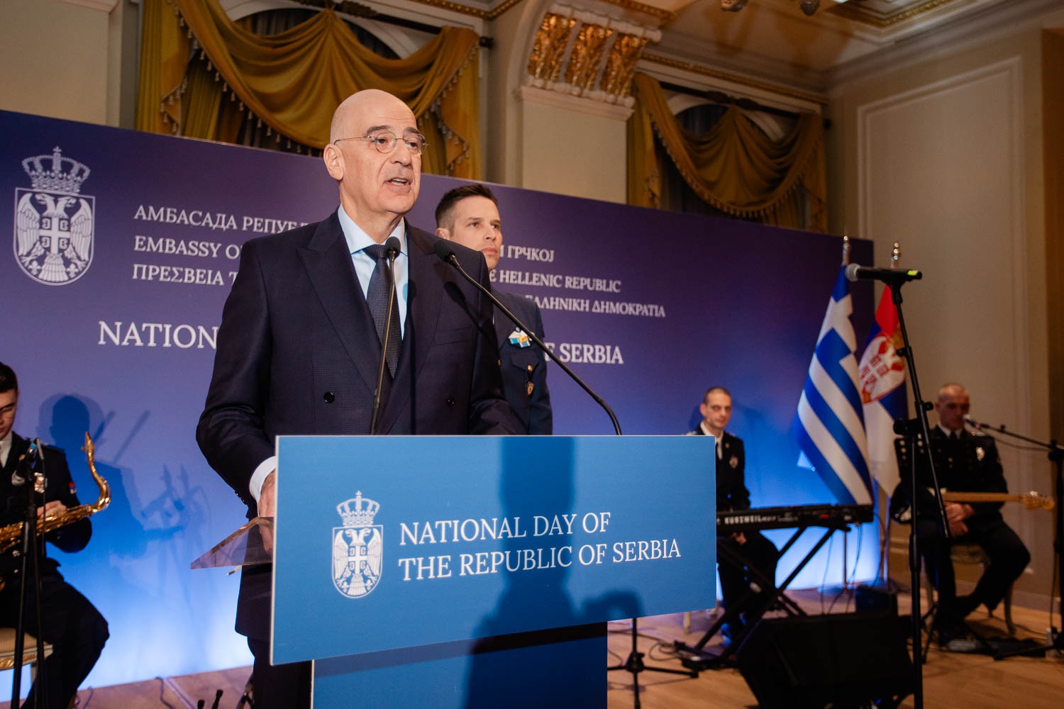 Након обраћања амбасадора Недељковића, присутнима се обратио министар националне одбране Грчке Никос Дендијас. На почетку излагања нагласио је да Србија и Грчка негују дубоке историјске, духовне и стратешке везе, утемељене на заједничком православном наслеђу и вековној културној повезаности два народа. Министар Дендијас је подсетио и на бројне сличности у традицијама, празницима и породичним обичајима, које, како је навео, сведоче о дубокој блискости два народа. У том контексту, издвојио је лична искуства, истичући да је два пута у последње три године имао част да присуствује прослави крсне славе Светог Николе у дому председника Републике Србије Александра Вучића. Како је рекао, тада је осетио атмосферу готово идентичну оној у типичној грчкој породици — снажну верску посвећеност, јаке породичне везе и искрену срдачност према пријатељима. Посебан део говора министар Дендијас посветио је историјском савезништву Србије и Грчке. Подсетио је да потиче са острва Крф, места од изузетног значаја за српски народ, и додао да је са Србијом повезан и лично, још пре политичког ангажмана, будући да се његова адвокатска канцеларија на Крфу налази непосредно преко пута Српске куће и Почасног конзулата Србије. „У трајном сећању остаће ми српска застава која се вијорила преко пута мог прозора“, истакао је министар, наглашавајући да су српска војничка гробља на Виду трајни симбол братства два народа. На крају, министар Дендијас је поновио снажну подршку Грчке европском путу Србије и истакао да се партнерство две државе продубљује у областима безбедности, економије, туризма и културе. Пожелео је Србији мир и просперитет, нагласивши да пријатељство два народа представља важан ослонац стабилности у региону.